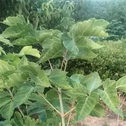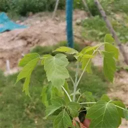 叶纸质,基部近于圆形或楔形,外貌椭圆形或倒卵形,长6-10厘米,通常浅3裂,裂片向前延伸,稀全缘,中央裂片三角卵形,急尖、锐尖或短渐尖;侧裂片短钝尖或甚小,以至于不发育,裂片边缘通常全缘,稀具少数锯齿;裂片间的凹缺钝尖;上面深绿色,下面黄绿色或淡绿色,被白粉,略被毛,在叶脉上较密;初生脉3条,稀基部叶脉也发育良好,致成5条,在上面不显著,在下面显著;侧脉通常在两面都不显著;叶柄长2.5-5厘米,淡紫绿色,细瘦,无毛。