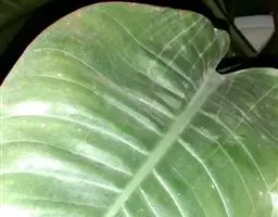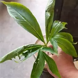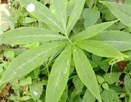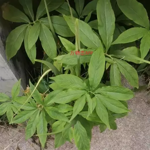叶1-3或更多,叶柄淡绿色,长20-70厘米,下部具鞘;叶片鸟足状分裂,裂片6-11,披针形,渐尖,基部渐狭,楔形,中裂片长15-18厘米,宽3厘米,两侧裂片依次渐短小,最外的有时长仅4-5厘米;侧脉6-7对,离边缘3-4毫米处弧曲,连结为集合脉,网脉不明显。