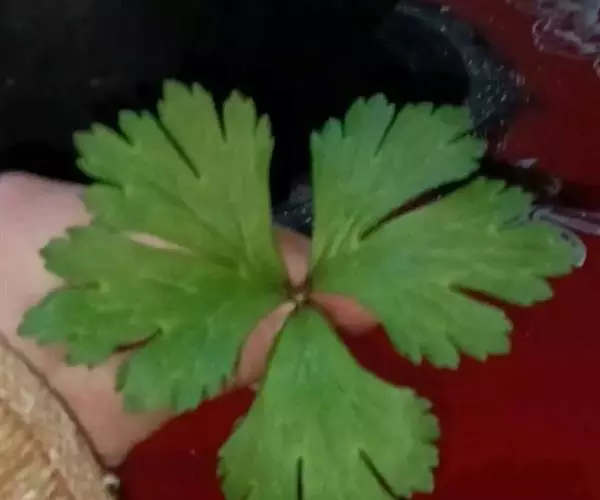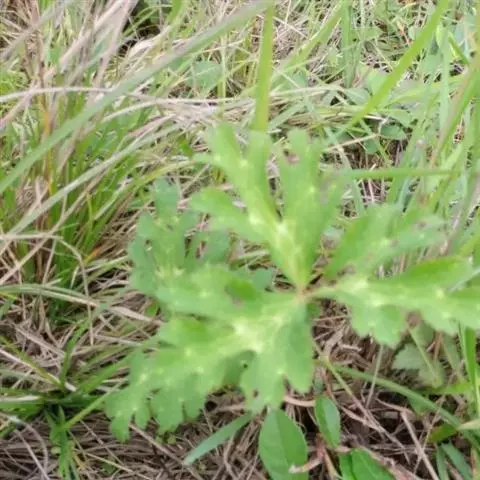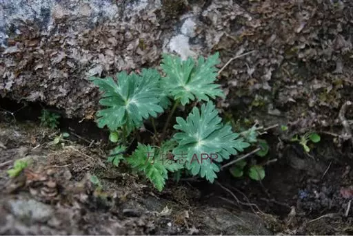 基生叶1-2,有长柄;叶片薄草质,五角形,长3.5-7.5厘米,宽6.5-14厘米,基部深心形,三全裂,中全裂片菱形,三裂,末回裂片卵形或宽披针形,有1-3齿或全缘,侧全裂片不等二深裂,表面有疏毛,背面通常无毛或近无毛,脉平;叶柄长10-28厘米,无毛或近无毛。