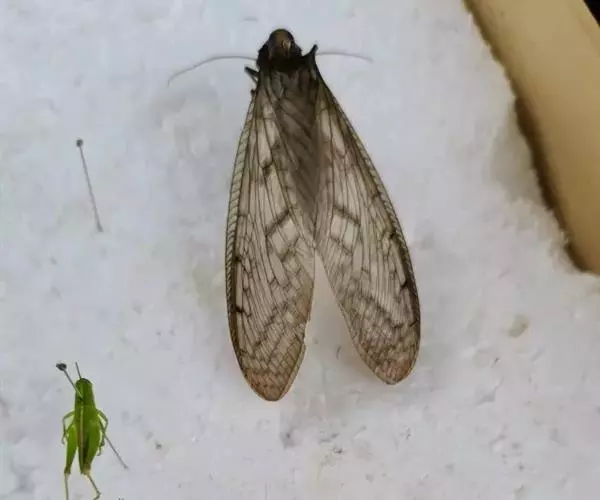 成虫出现於5至8月,生活在平地至低海拔地区树木枝干上。夜晚有趋光性,趋光个体还会鸣叫。 展开双翅的蟪蛄 简要介绍:山东地区俗称小熟了,体长35-38mm﹐吻长﹐黄绿色﹐有黑色条纹﹐翅膀有黑斑﹐雄的腹部有发音器﹐夏末自早至暮鸣声不息。