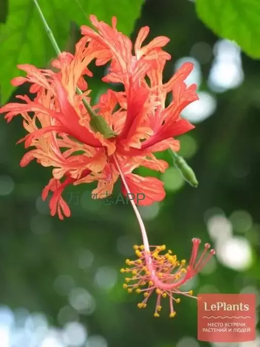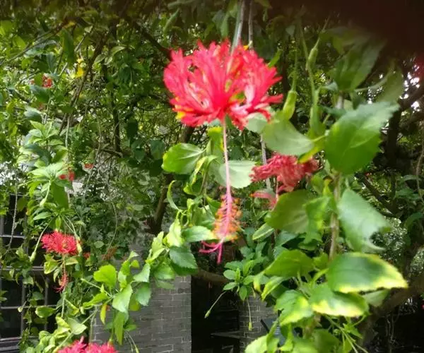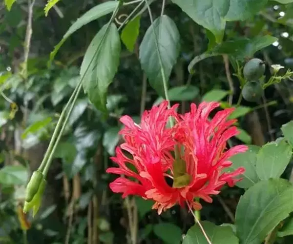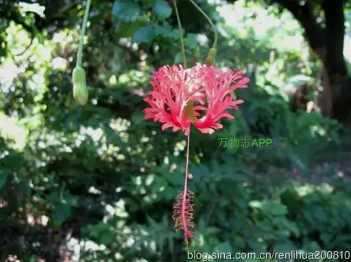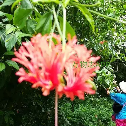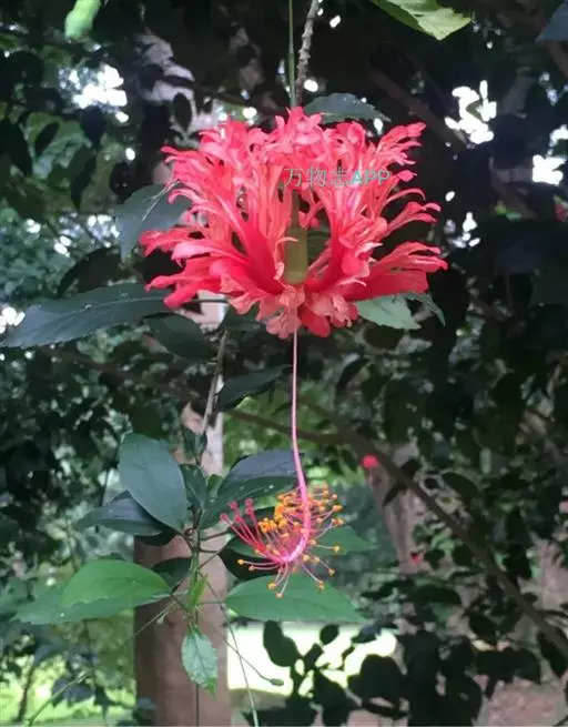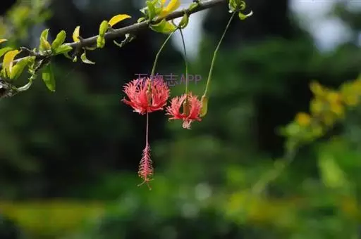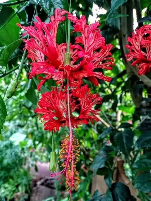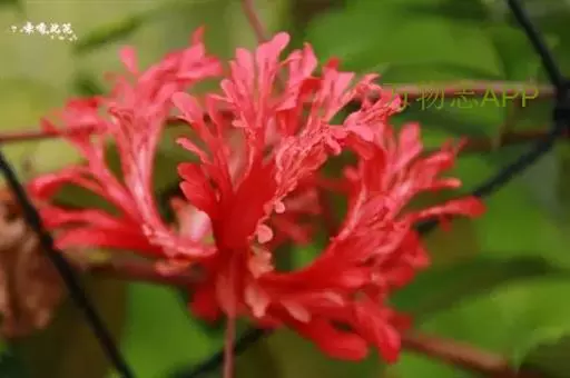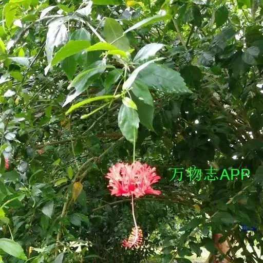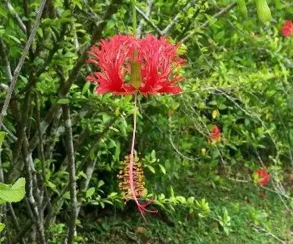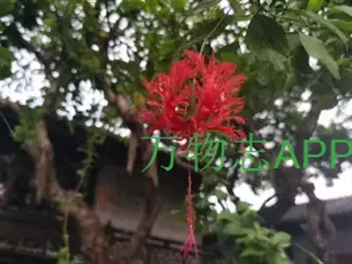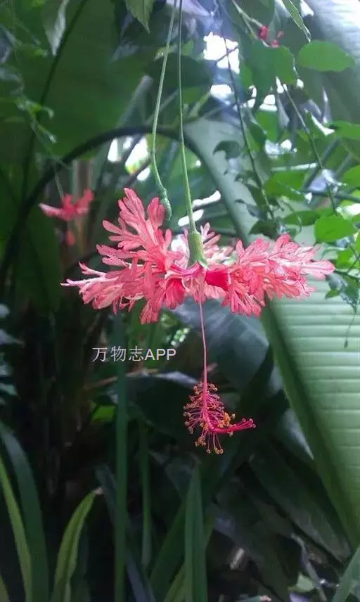吊灯扶桑(学名:Hibiscus schizopetalus (Masters) Hook.f.):常绿直立灌木,高达3米;小枝细瘦,常下垂,平滑无毛。叶椭圆形或长圆形,边缘具齿缺,两面均无毛;托叶钻形,长约2毫米,常早落。花单生于枝端叶腋间;小苞片5,极小,披针形。花瓣5,红色,长约5厘米,深细裂作流苏状,向上反曲;雄蕊柱长而突出,下垂,长9-10厘米,无毛。蒴果长圆柱形,长约4厘米,直径约1厘米。花期全年。