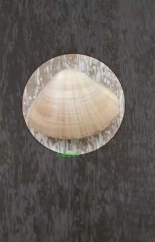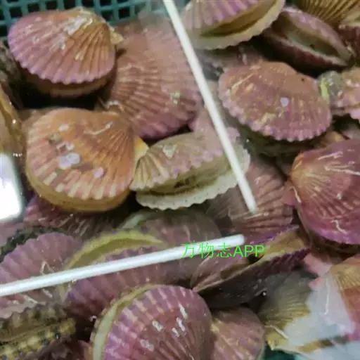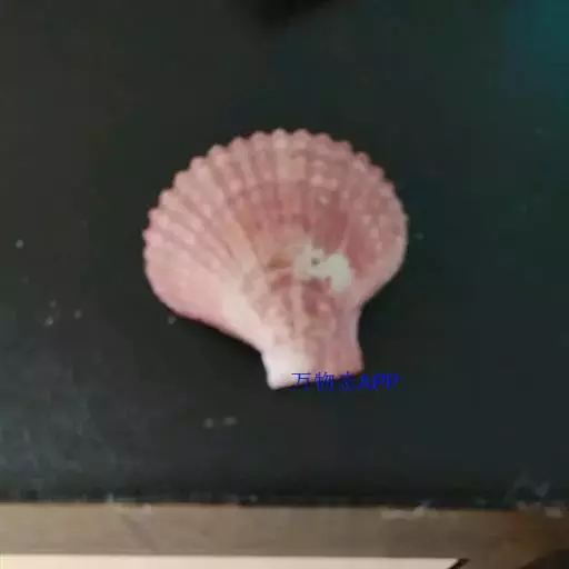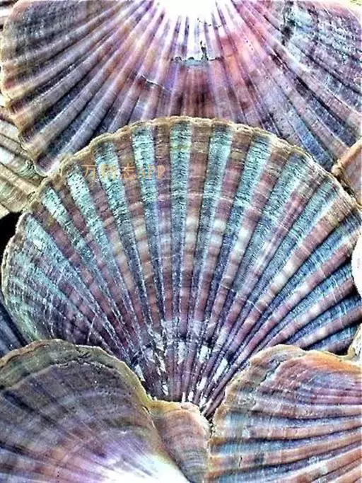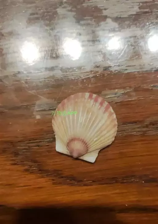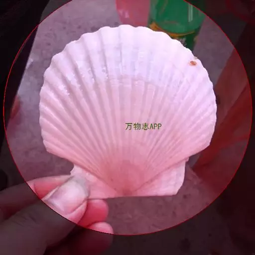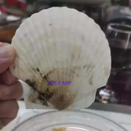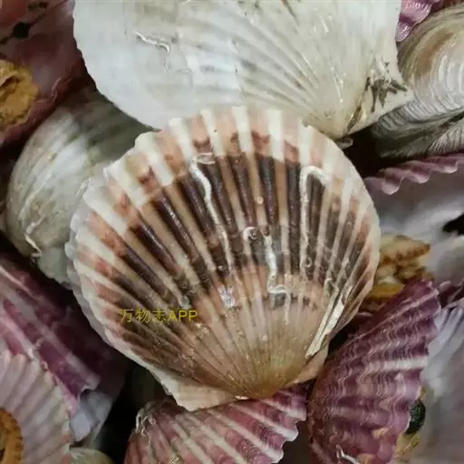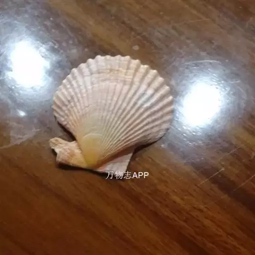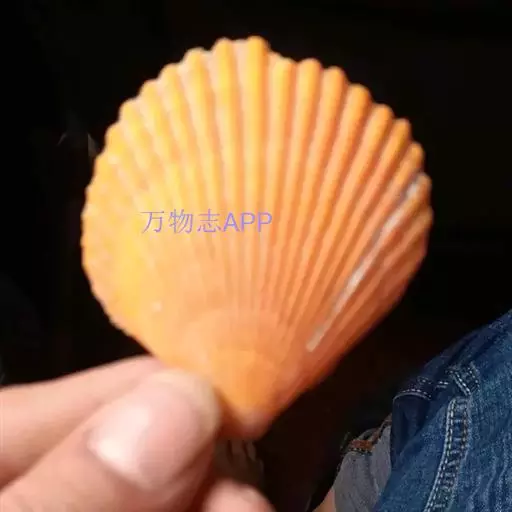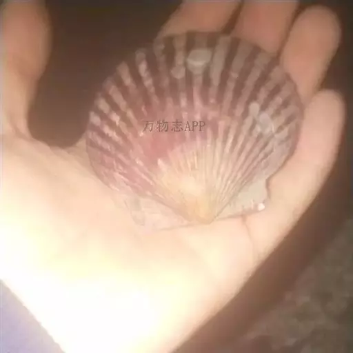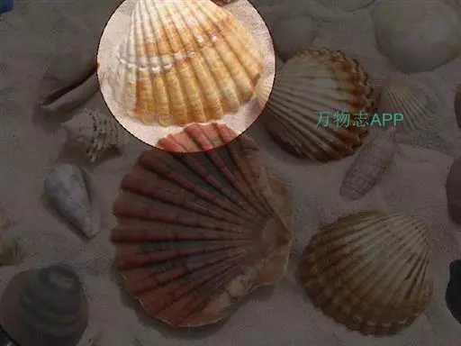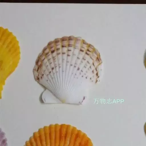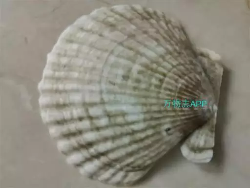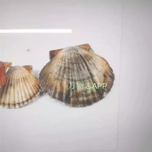 贝壳中等大小,壳质较薄,但很坚韧,呈圆形。壳较凸,两壳及壳两侧均略等,壳背缘较直,腹缘及前、后缘均呈圆形。两壳关闭时两侧略留有狭孔。壳顶尖、低,不突出壳背缘。壳顶前方和后方有壳耳左壳两耳略等右壳前耳略较后耳小,呈长方形其他皆呈三角形足丝孔位于右壳前耳下方,较小,呈三角形,具数枚细栉柿齿。壳表多呈灰褐色或浅黄褐色,具深褐色或紫褐色云状花斑,一般左壳的颜色较浅而右壳较深。两壳面皆布满放射肋肋呈圆形,较光滑,约有18条左右,肋上的生长小棘较低平左壳肋较窄,肋间距离较宽右壳相反,肋较宽而肋间距离较窄。贝壳内面色浅,略近白色,稍具光泽闭壳肌痕略显,近圆形有与壳面相应的肋与沟。铰合部较细长,韧带深褐色,位于三角形的韧带槽中,中央关节较明显。