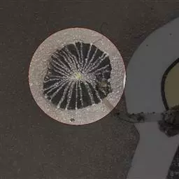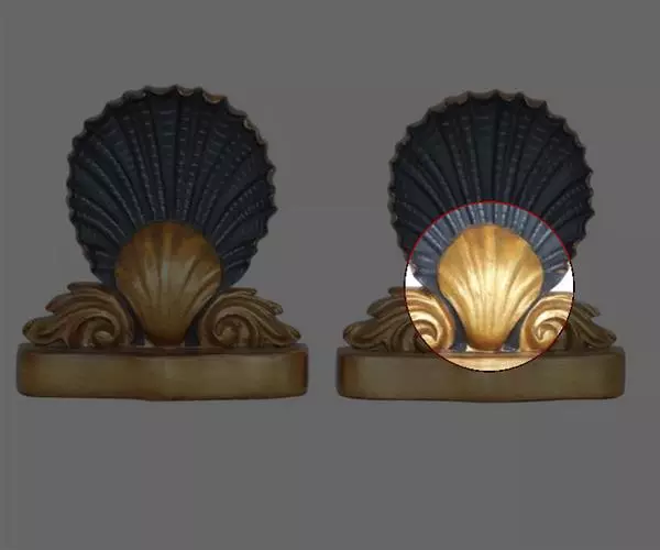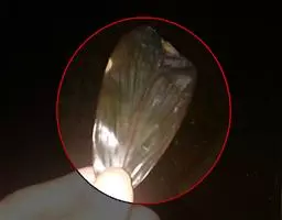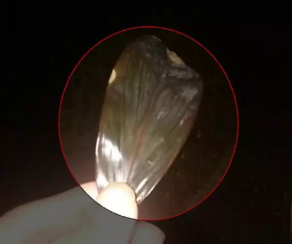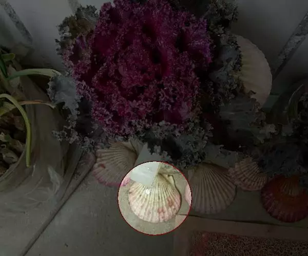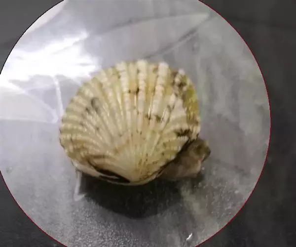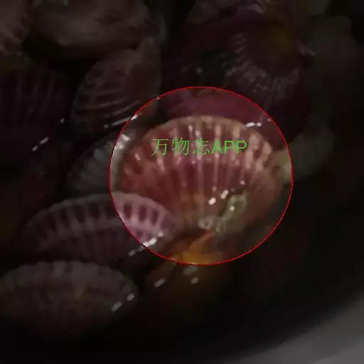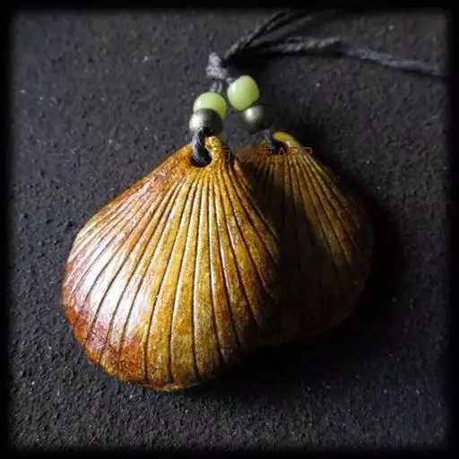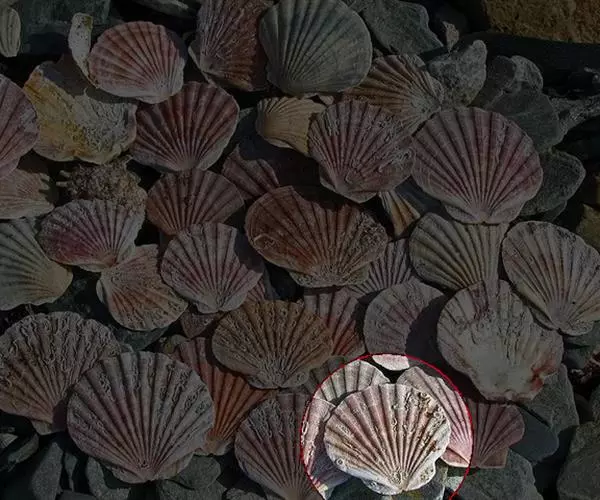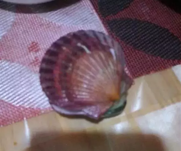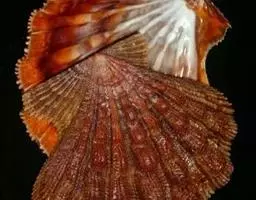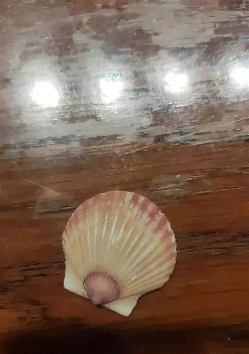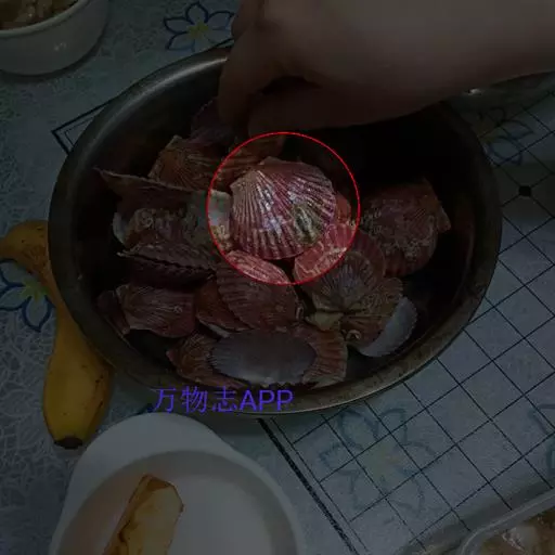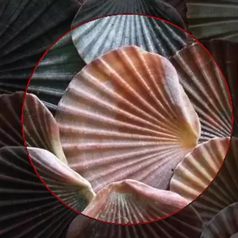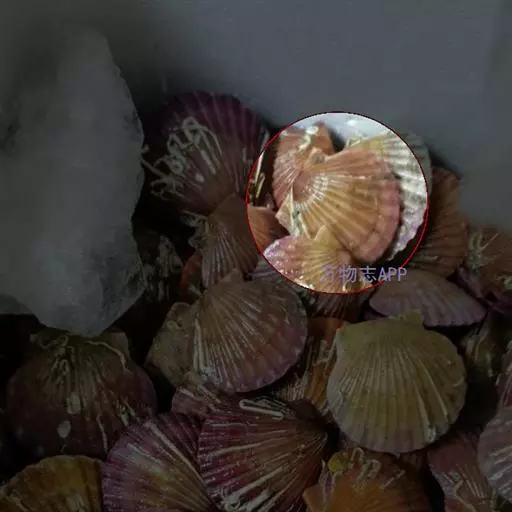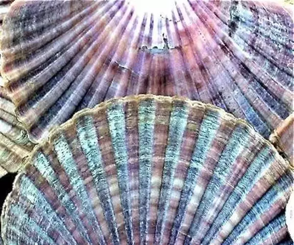 贝壳中等大小,壳质较薄,但很坚韧,呈圆形。壳较凸,两壳及壳两侧均略等,壳背缘较直,腹缘及前、后缘均呈圆形。两壳关闭时两侧略留有狭孔。壳顶尖、低,不突出壳背缘。壳顶前方和后方有壳耳左壳两耳略等右壳前耳略较后耳小,呈长方形其他皆呈三角形足丝孔位于右壳前耳下方,较小,呈三角形,具数枚细栉柿齿。壳表多呈灰褐色或浅黄褐色,具深褐色或紫褐色云状花斑,一般左壳的颜色较浅而右壳较深。两壳面皆布满放射肋肋呈圆形,较光滑,约有18条左右,肋上的生长小棘较低平左壳肋较窄,肋间距离较宽右壳相反,肋较宽而肋间距离较窄。贝壳内面色浅,略近白色,稍具光泽闭壳肌痕略显,近圆形有与壳面相应的肋与沟。铰合部较细长,韧带深褐色,位于三角形的韧带槽中,中央关节较明显。