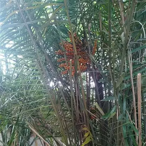 茎丛生,矮小,高2-4米,直径3.5-4厘米,绿色,表面不被微白色的毡状绒毛。叶长2.5-3.5米;羽片楔形或斜楔形,长11-18(-27)厘米,宽4-8厘米,基部两侧不对称,幼叶薄而脆,老叶近革质,外缘常为笔直,内缘弧曲或不规则的齿缺,且延伸成尾尖;叶柄长1-1.25米,近圆形,直径1.5-2.5厘米;叶鞘具细条纹,边缘具网状的褐色纤维。佛焰苞管状,长20-30厘米,顶端斜截,套接,被毡状的褐色绒毛;花序长40-80厘米,常不分枝,偶从基部分出一短枝,无毛;雄花蕾时短圆锥状,花时椭圆形,萼片宽卵形,长4-5毫米,宽7-8毫米,顶端全缘,不具睫毛,花瓣长圆形,长9-11毫米,宽5-6毫米,紫红色,雄蕊90-130枚,花药线形,长约8毫米,黄色,花丝短,近白色;雌花萼片宽卵形,长3-4毫米,顶端全缘或微凹,无毛,花瓣狭卵形,长5-7毫米,宽2-3毫米,顶端具尖头,紫红色;退化雄蕊2-3枚,丝状,淡绿色,与花瓣对生;子房卵状三棱形,柱头无柄。果实球形,直径2.5-3.5厘米,成熟时紫红色。种子2颗,半球形,胚乳嚼烂状。花期3-5月,果期7-10月。 [1-2]