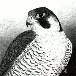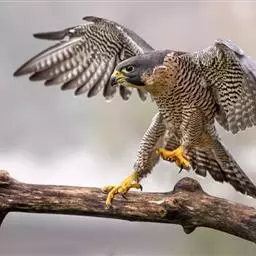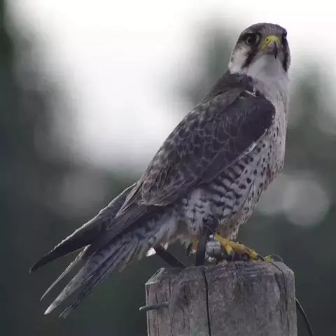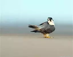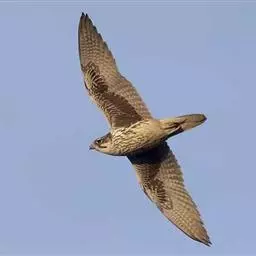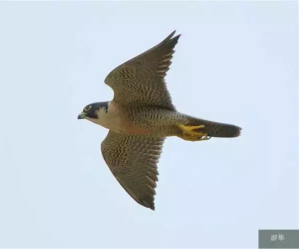 游隼(学名:Falco peregrinus):是中型猛禽,共有18个亚种。体长41-50厘米。翅长而尖,眼周黄色,颊有一粗著的垂直向下的黑色髭纹,头至后颈灰黑色,其余上体蓝灰色,尾具数条黑色横带。下体白色,上胸有黑色细斑点,下胸至尾下覆羽密被黑色横斑。飞翔时翼下和尾下白色,密布白色横带,常在鼓翼飞翔时穿插着滑翔,也常在空中翱翔,野外容易识别。幼鸟上体暗褐色,下体淡黄褐色,胸、腹具黑褐色纵纹。