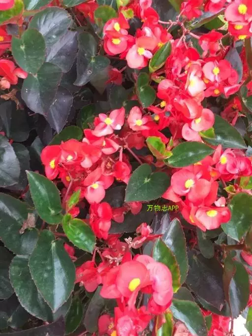多年生常绿草本,茎直立,稍肉质,高15-30厘米。单叶互生,有光泽,卵圆至广卯圆形,长5-8厘米,宽3-6厘米,先端急尖或钝,基部稍心形而斜生,边缘有小齿和缘毛,绿色。聚伞花序腋生,具数花,花红色,淡红色或白色。蒴果具翅。花期3-12月。 四季秋海棠