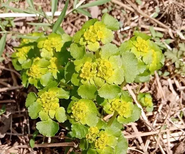 多年生草本,高5-19cm。无单宁质斑纹;鞭匐枝具鳞片状叶,边缘具褐色柔毛;全株金黄色;根茎细弱。茎直立,无毛或稍有毛。叶互生,有长柄;基生叶较大,叶柄长2.5-4cm,疏生褐色柔毛;叶片肾形至圆状肾形,长0.8-2.5cm,宽1-3cm,边缘具圆齿,齿端具小疣点,两面和边缘均疏被柔毛;茎生叶通常1片,稀不存在,肾形,长0.4-1cm,宽0.7-1.7cm。伞房花序,长达3mm,苞叶卵形,长0.4-1.5cm,宽达2cm,稀全缘;花黄色,萼片4,卵形,带绿色,里面黄色;无花瓣;雄蕊8,短于萼;子房半下位,1室,花柱直立或叉开。蒴果与萼等长,蒴果先端微凹,两果瓣近等大,具喙。种子宽卵圆形,黑棕色,平滑有光泽。花期5-6月,果期7-8月。