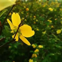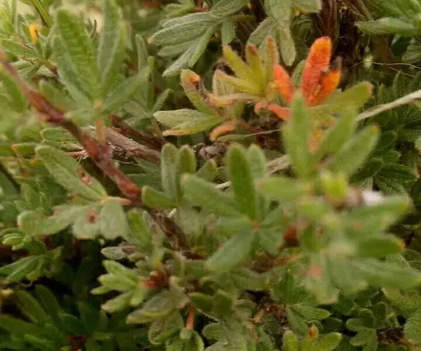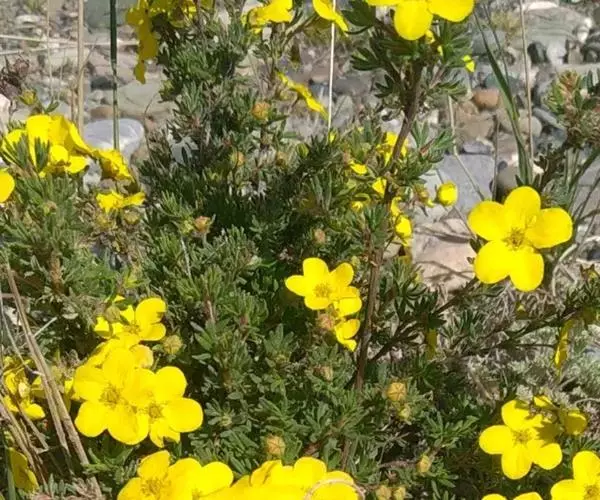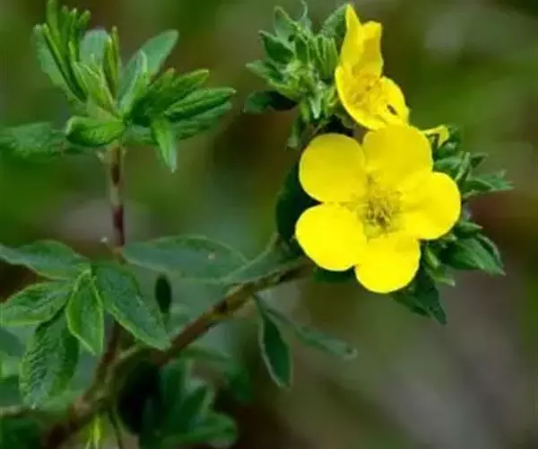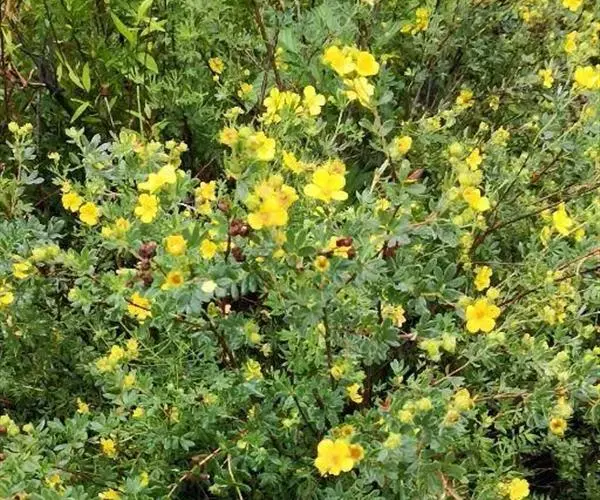 金露梅(学名:Potentilla fruticosa L.)是蔷薇科,委陵菜属灌木植物,高可达2米,树皮纵向剥落。小枝红褐色,羽状复叶,叶柄被绢毛或疏柔毛;小叶片长圆形、倒卵长圆形或卵状披针形,两面绿色,托叶薄膜质,单花或数朵生于枝顶,花梗密被长柔毛或绢毛;萼片卵圆形,顶端急尖至短渐尖,花瓣黄色,宽倒卵形,顶端圆钝,比萼片长;花柱近基生,瘦果褐棕色近卵形,6-9月开花结果。
