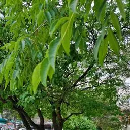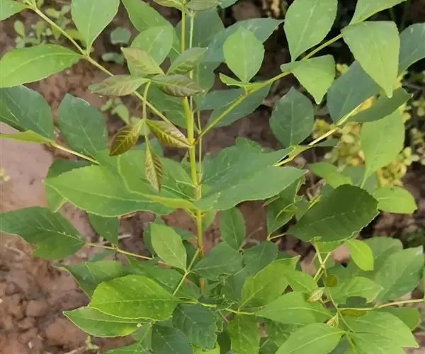 羽状复叶长15-25厘米;叶柄长4-6厘米,基部不增厚;叶轴挺直,上面具浅沟,初时疏被柔毛,旋即秃净;小叶5-7枚,硬纸质,卵形、倒卵状长圆形至披针形,长3-10厘米,宽2-4厘米,顶生小叶与侧生小叶近等大或稍大,先端锐尖至渐尖,基部钝圆或楔形,叶缘具整齐锯齿,上面无毛,下面无毛或有时沿中脉两侧被白色长柔毛,中脉在上面平坦,侧脉8-10对,下面凸起,细脉在两面凸起,明显网结;小叶柄长3-5毫米。