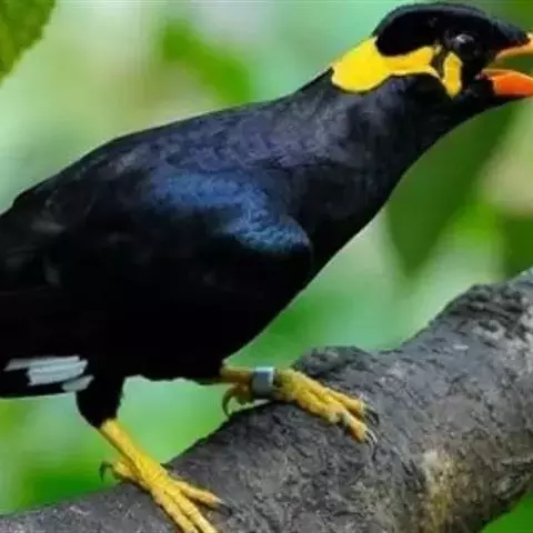 金冠树八哥为椋鸟科树八哥属的鸟类。体长约23厘米,闪辉黑色。特征为具翼斑及颏黄色,脸颊裸露皮肤粉黄色。…