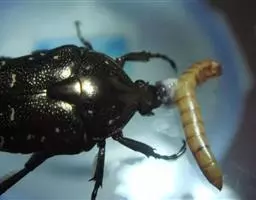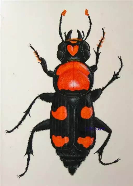 埋葬虫妈妈要在幼虫中间做出选择,幸运的可以得到食物,不幸的便被自己吃掉。通常情况下,埋葬虫繁育的幼虫数量超过老鼠肉所能满足的数量。这种吃掉亲骨肉的策略能够提高幼虫的整体存活率,是一种不得已的做法。 埋葬虫图示