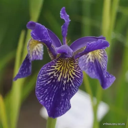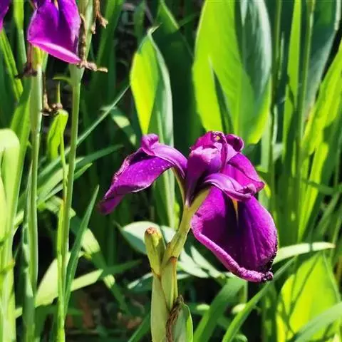双色野鸢尾为多年生草本植物,叶子呈剑状淡绿色。…