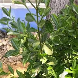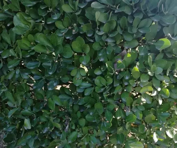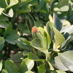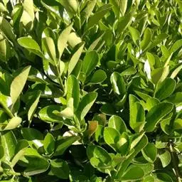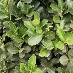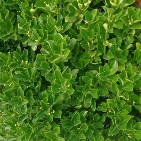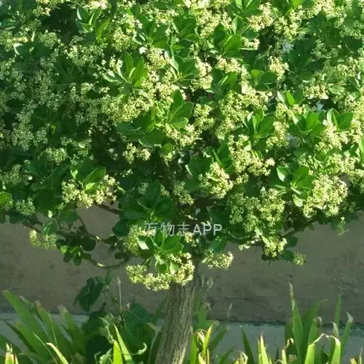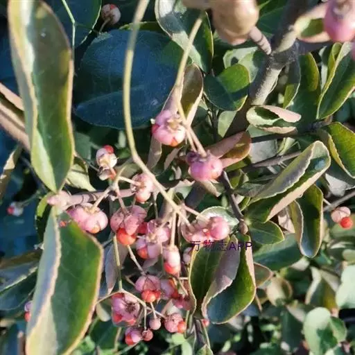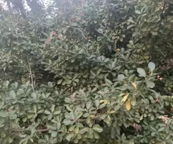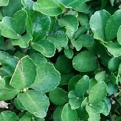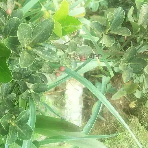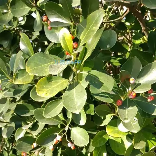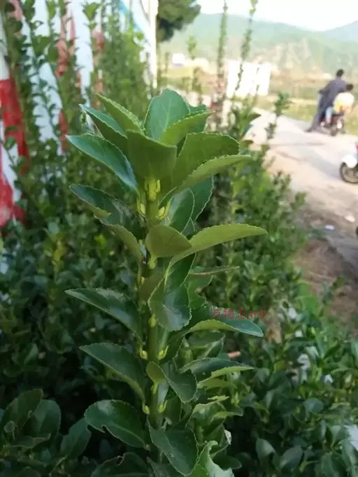 冬青卫矛(学名:Euonymus japonicus Thunb.):俗名大叶黄杨或简称“黄杨”。灌木,高可达3米;小枝四棱,具细微皱突。叶革质,有光泽,倒卵形或椭圆形,先端圆阔或急尖,基部楔形,边缘具有浅细钝齿。聚伞花序5-12花,分枝及花序梗均扁壮,花白绿色,直径5-7毫米;花瓣近卵圆形,长宽各约2毫米。蒴果近球状,淡红色;种子每室1,顶生,椭圆状,假种皮桔红色,全包种子。花期6-7月,果熟期9-10月。