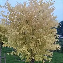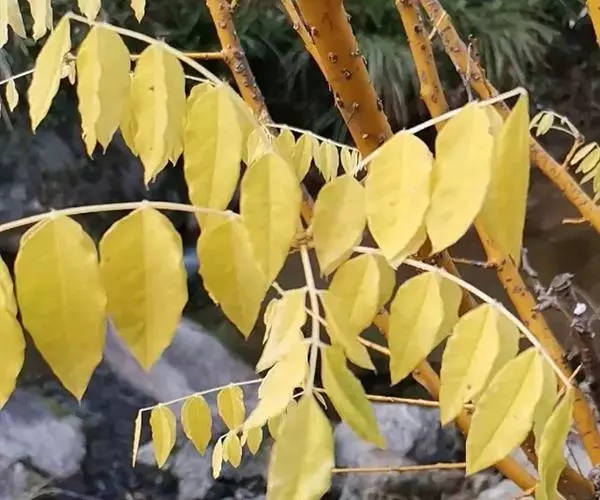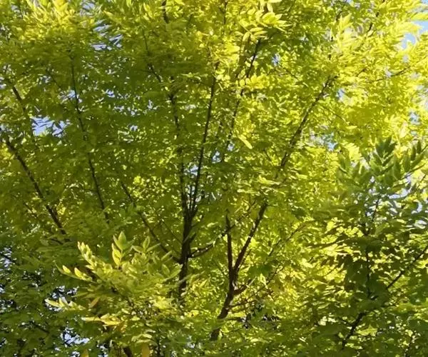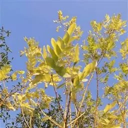 金枝槐树茎、枝一年生为淡绿黄色,入冬后渐转黄色,二年生的树茎、枝为金黄色,树皮光滑;叶互生,6~16片组成羽状复叶,叶椭圆形,长2.5~5厘米,光滑,淡黄绿色。树干墙直,树形自然开张,树态苍劲挺拔,树繁叶茂;主侧根系发达。生长快,当年嫁接苗可长1.5~2米高,第二年2.5~3.5米;性耐寒,能抵抗-30℃的低温;抗干旱性强,耐瘠薄。