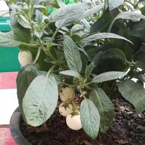 叶片生有绒毛。浆果,卵圆形或圆锥形,成熟时果皮淡黄色,有些品种有紫色的条形斑纹,直径8-10毫米。花期4-6月,果期9-11月。果肉浅乳黄色。种子浅黄色,似茄子种子,使用年限为2年。根状茎长圆柱形,直径1-1.5厘米,多节,绿色至黄色。