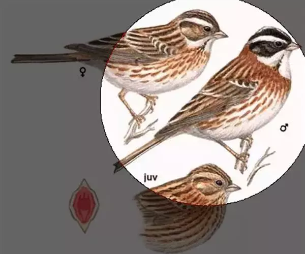 北方亚种雄鸟额、头顶、枕、后颈黑褐色具不甚显著的灰白色或灰色羽缘。上背和两肩亦为黑褐色具不明显的棕栗色羽缘,有的标本从头至下背黑褐色具橄榄褐色羽缘,腰和尾上覆羽棕色更著;尾羽黑褐色,除最外侧1-2对尾羽外,其余尾羽基部羽缘均缀有棕栗色。两翅黑褐色,外翈缘以棕白色,翅上大覆羽和中覆羽多呈栗棕色具白色端斑,飞羽黑褐色,除第一枚初级飞羽外翈无棕色渲染、内翈基部缀有淡棕色外,其余飞羽内外翈均缀有棕栗色,且越往内棕栗色所占面积越大,在两翼形成明显的棕栗色翼斑。眼先和耳羽黑褐色,眉纹白色或棕白色,颊棕白色具黑色斑点。颏、喉棕白或淡皮黄白色,喉的两侧缀有黑褐色斑点,有的标本里褐色斑点一直扩展到整个喉部;胸和两胁黑褐色或黑色、具棕白色或白色羽缘;腹白色,尾下覆羽棕褐色具白色羽端。雌鸟和雄鸟相似,但上体较少棕色,腋羽和翅下覆羽棕栗色。