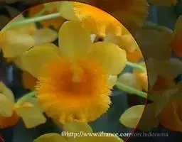 独角石斛,Dendrobium unicum,兰科石斛属植物。花瓣橙黄色,唇瓣反转似犀牛角,…
