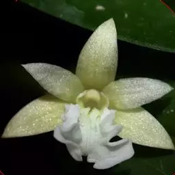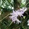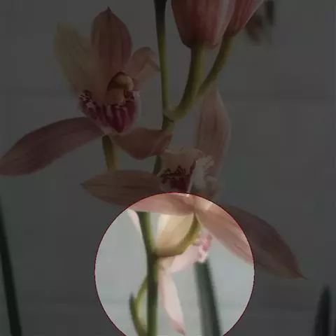 总状花序通常出自落了叶的老茎上部,具1-3朵花;花序柄较粗短,长2-5毫米,基部被1-2枚长约6毫米的筒状鞘;花苞片浅白色,纸质,宽卵形,长约8毫米,先端钝;花梗黄绿色,连同淡紫红色的子房长3-4厘米;花大,白色,上部紫红色,开展,具香气,干后蜡质状;中萼片长圆形,长约3厘米,宽1厘米,先端锐尖,具5条脉;侧萼片与中萼片等大,同形,先端锐尖,基部稍歪斜,具5条脉;萼囊紫红色,近圆锥形,长约5毫米。