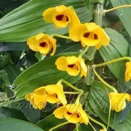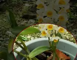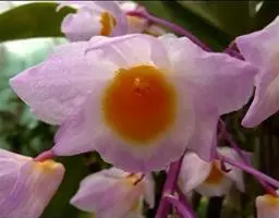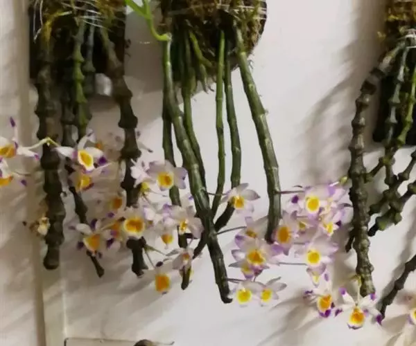肿节石斛(学名:Dendrobium pendulum Roxb.):茎斜立或下垂,肉质状肥厚,圆柱形,不分枝,具多节,节肿大呈算盘珠子样。叶纸质,长圆形,先端急尖,基部具抱茎的鞘;叶鞘薄革质。总状花序通常出自落了叶的老茎上部,具1-3朵花;花大,白色,上部紫红色,开展,具香气,干后蜡质状;花瓣阔长圆形,长3厘米,宽1.5厘米,先端钝,基部近楔形收狭,边缘具细齿,具6条脉和多数支脉;唇瓣白色,中部以下金黄色,上部紫红色,近圆形。花期3-4月。