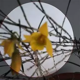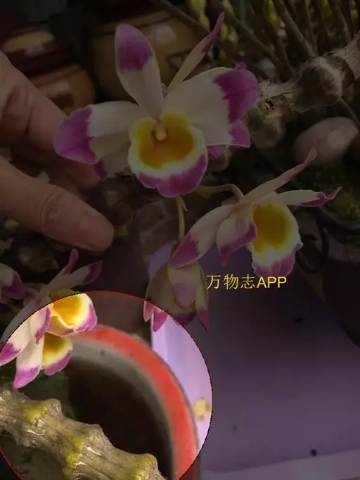 花瓣阔长圆形,长3厘米,宽1.5厘米,先端钝,基部近楔形收狭,边缘具细齿,具6条脉和多数支脉;唇瓣白色,中部以下金黄色,上部紫红色,近圆形,长约2.5厘米,中部以下两侧围抱蕊柱,基部具很短的爪,边缘具睫毛,两面被短绒毛;蕊柱长约4毫米,下部扩大,背面稍被细乳突;药帽近圆锥形,被细乳突状毛,前端稍收狭而近截形并具啮蚀状。花期3-4月。