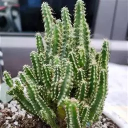 用利刀在霸王花的三棱柱适当高度横切一刀,然后将三个棱峰作30-40度切削,用消过毒的仙人刺刺入砧木中间维管束,将切平的接穗连接在刺的另一端,用刺将接穗和砧木连接起来,砧木和接穗尽量贴紧不留空隙,避免细菌感染不利愈合,然后在两旁各加一刺固定,再用细线绕基部捆紧。