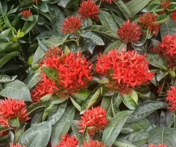 龙船花繁花时节,红似火、橙如霞,花浮于叶面上,且花期长,花色丰富,有红、黄、橙、白等,因而在园林中常大面积片植成带状,在道路旁或车道中间的隔离带,地植成大色块,非常有气势、非常状观,随着季节和花色的不同,呈现给人们的是彩色花带。适宜作花带的品种有矮龙船花系列。在空旷和平坦的地段,片植成跳跃式大色块,是园林绿化中常用的手法。 龙船花 观赏种植