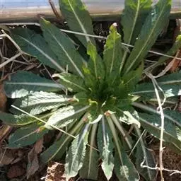 基生叶莲座状,倒披针形,长15-25厘米,宽4-5厘米,先端锐尖或稍钝,基部渐狭并下延为翅,边缘自下向上有远离的浅波状齿,侧脉5-8对,白色或红色,上部深绿色至亮绿色,两面被曲柔毛与长毛;叶柄长3-4厘米;茎生叶螺旋状互生,狭椭圆形至披针形,自下向上变小,长5-13厘米,宽2.5-3.5厘米,先端锐尖或稍钝,基部楔形,边缘疏生远离的齿突,侧脉8-2对,毛被同基生叶的;叶柄长2-15毫米,向上变短 。