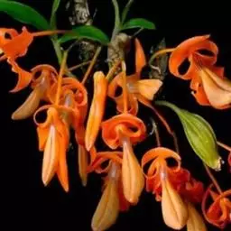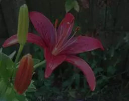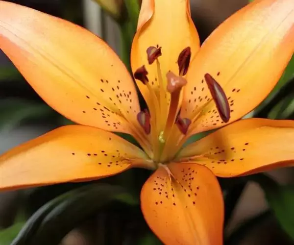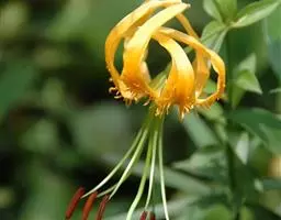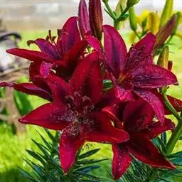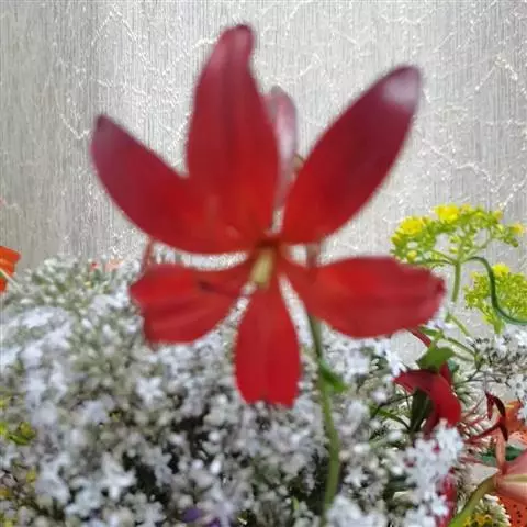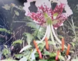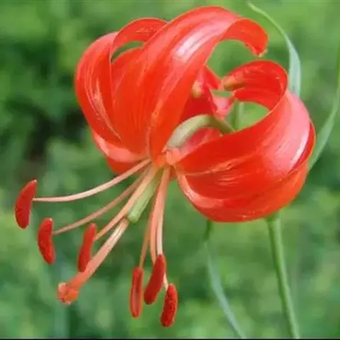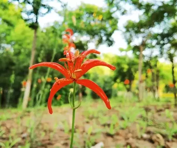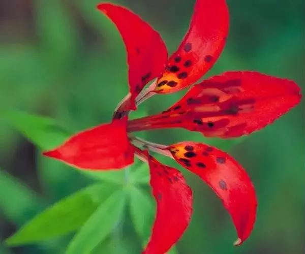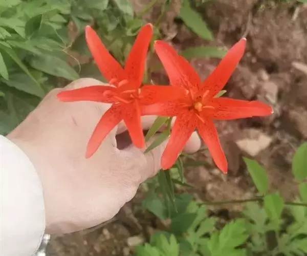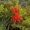 花1-5朵排成近伞形或总状花序;花梗长1.2-4.5厘米;花直立,星状开展,深红色,无斑点,有光泽;花被片有斑点,矩圆状披针形,长2.2-4厘米,宽4-7毫米,蜜腺两边具乳头状突起;雄蕊向中心靠拢;花丝长1.8-2厘米,无毛,花药长矩圆形,长约7毫米;子房圆柱形,长1-1.2厘米,宽2.5-3毫米;花柱稍短于子房,柱头稍膨大。蒴果矩圆形,长3-3.5厘米,宽约2-2.2厘米。花期6-7月,果期8-9月。
