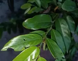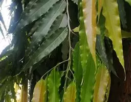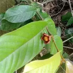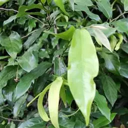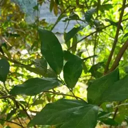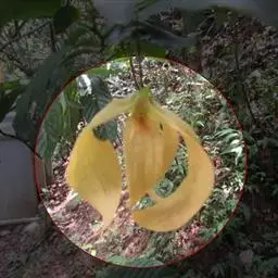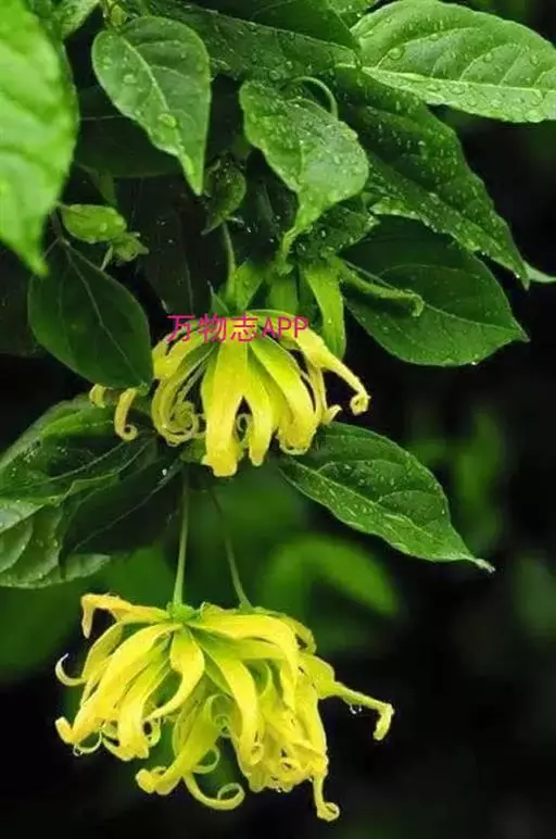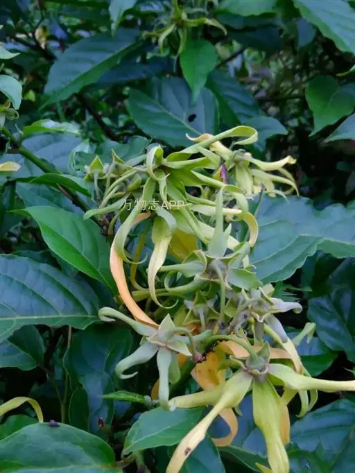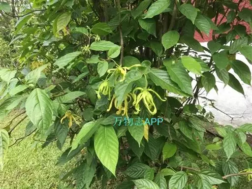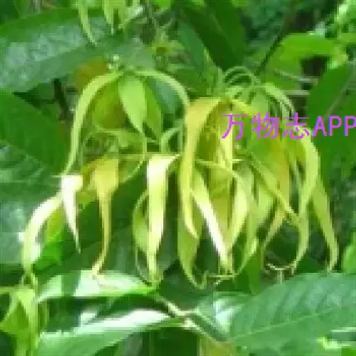 依兰 常绿大乔木,高达20多米,胸径达60厘米;树干通直,树皮灰色;小枝无毛,有小皮孔。叶大,膜质至薄纸质,卵状长圆形或长椭圆形,长10-23厘米,宽4-14厘米,顶端渐尖至急尖,基部圆形,叶面无毛,叶背仅在脉上被疏短柔毛;侧脉每边9-12条,上面扁平,下面凸起;叶柄长1-1.5厘米。