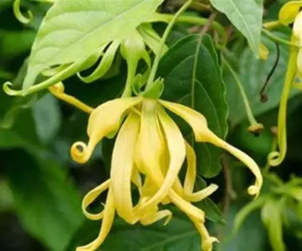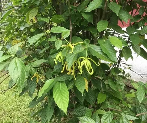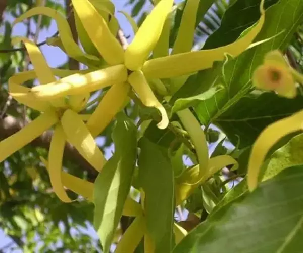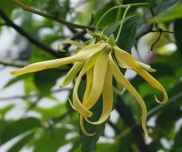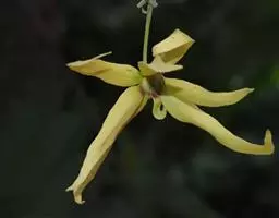 依兰(学名:Cananga odorata (Lamk.) Hook. f. et Thoms. )是番荔枝科,依兰属常绿大乔木,高可达20米,树干通直,树皮灰色;叶大,膜质至薄纸质,叶片卵状长圆形或长椭圆形,叶面无毛,叶背仅在脉上被疏短柔毛;上面扁平,下面凸起;花序单生于叶腋内或叶腋外,花大,黄绿色,芳香,花梗被短柔毛,有鳞片状苞片;萼片卵圆形,外反,绿色,花瓣线形或线状披针形,雄蕊线状倒披针形,果近圆球状或卵状,黑色。4-8月开花,12月至翌年3月结果。