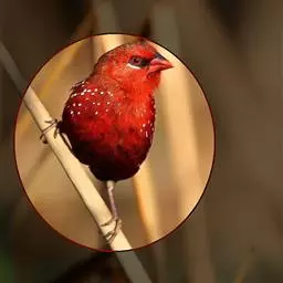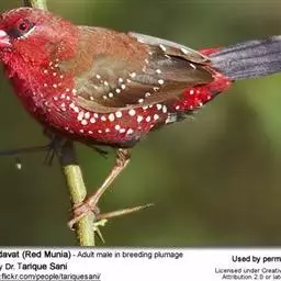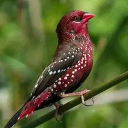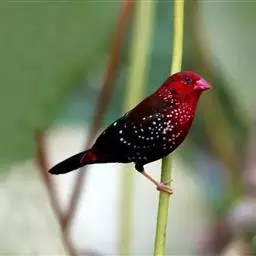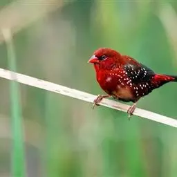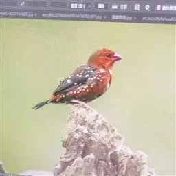 红梅花雀小型鸟类,体长9-10厘米。雄鸟通体朱红色,背、肩、胸等满布白色小斑点,…