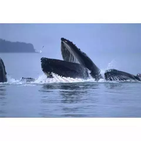 座头鲸进食的方法也很奇妙,首先是冲刺式进食法,将下腭张得很大,侧着或仰着身子朝虾群冲过去,然后把嘴闭上,下腭下边的折皱张开,吞进大量的水和虾,最后将水排除出去,把虾吞食;第二种方法叫轰赶式进食法,将尾巴向前弹,把虾赶向张开的大嘴,这种方法也是只有当虾特别密集时才适用;第三种方法是从大约15米深处作螺旋形姿势向上游动,并吐出许多大小不等的气泡,使最后吐出的气泡与第一个吐出的气泡同时上升到水面,形成了一种圆柱形或管形的气泡网,像一只巨大的海中蜘蛛编结成的蜘网一样,把猎物紧紧地包围起来,并逼向网的中心,它便在气泡圈内几乎直立地张开大嘴,吞下网集的猎物。这种捕食方法,同捕鱼者用两只渔船拉曳大型渔网,逐渐迫使鱼虾接近水面,然后一网打尽的情景一样。当猎物数量稀少时,座头鲸常常单独或仅有2~3只在一起觅食,而当猎物数量很多时,便形成8只左右的较大群体,有时不同群体之间还会互相争食。因此,有时食物的多少、分布和种类,也会直接影响座头鲸的数量。