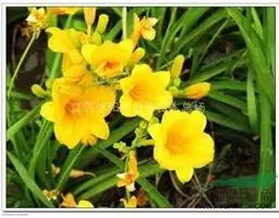 金娃娃萱草:是萱草的人工栽培的园艺品种。地下具根状茎和肉质肥大的纺锤状块根。叶基生,条形,排成两列,…
