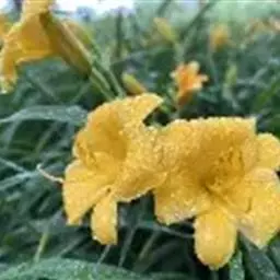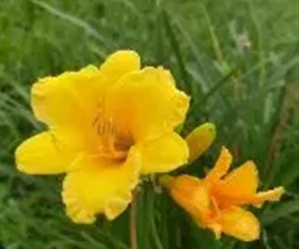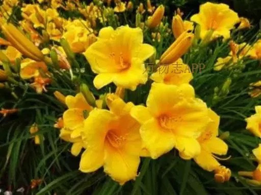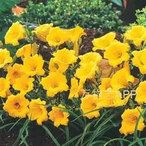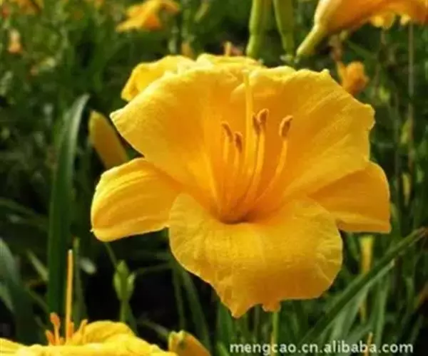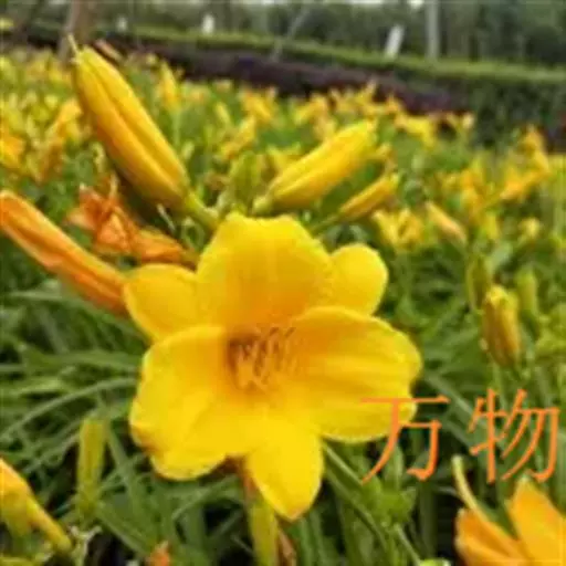金娃娃萱草(学名:Hemerocallis fulva ‘Golden Doll’):是萱草的人工栽培的园艺品种。地下具根状茎和肉质肥大的纺锤状块根。叶基生,条形,排成两列,长约25厘米,宽1厘米。株高30厘米,花莛粗壮,高约35厘米。螺旋状聚伞花序,花7至10朵。花冠漏斗形,花径约7至8厘米,金黄色。花期5至11月(6至7月为盛花期,8至11月为续花期),单花开放5至7天。