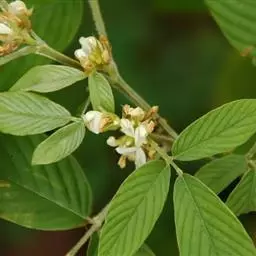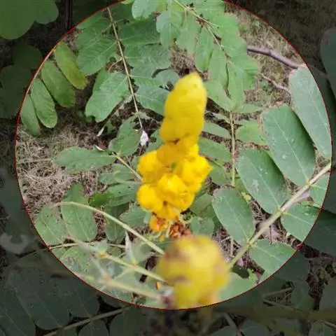 灌木 ,高约1米。茎、枝圆柱形,小枝“之”字形弯曲,密被开展、褐色短柔毛。托叶狭三角形,长6-7毫米,基部宽约2毫米,有条纹,被柔毛;叶柄长约3毫米,被褐色绒毛;小叶革质,顶生小叶披针形或长圆形,长13-20厘米,宽3.7-6厘米,先端渐狭而急尖,基部圆形或宽楔形,侧生小叶斜卵形,长3-4厘米,宽1.5-2厘米,先端急尖,上面疏被毛或近无毛,下面密被褐色软毛,侧脉每边8-15条,隆起,网脉明显;小托叶线形,长2毫米;小叶柄长1毫米,被褐色绒毛.伞形花序有花(5-)9-15朵,藏于叶状苞片内,由许多苞片排成顶生总状圆锥花序状,苞片斜卵形,先端微缺,长2.5-3.5厘米,宽2-2.7厘米;花梗长4-6毫米,被白毛;花萼长4-5毫米,被白色绒毛;花冠白色或淡黄色,旗瓣倒卵形,长8-9毫米,具瓣柄,冀瓣长7-8毫米,基部有耳,具瓣柄,龙骨瓣弧曲,长8-8.5毫米;雄蕊单体;雌蕊长9.5-10.5毫米,子房长3.5-4毫米,有胚珠7-8,花柱长5.5-6.5毫米,近基部处有柔毛。荚果长8-15毫米,宽3.5毫米,仅被缘毛,有荚节2-5,荚节近方形;种子宽椭圆形,长3毫米,宽2-2.3毫米。花期8-9月,果期10-11月。