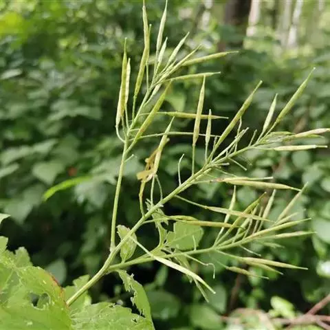 长角果圆筒状,长2.5-3厘米,宽约1毫米,无毛,稍内曲,与果梗不成1条直线,果瓣中脉明显;果梗长1-2厘米。种子每室1行,种子形小,多数,长圆形,长约1毫米,稍扁,淡红褐色,表面有细网纹。花期4-5月。