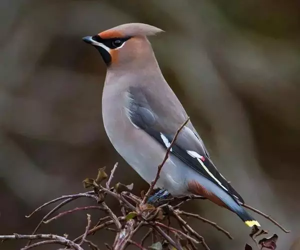 雄性成鸟:额及头顶前部栗色,愈向后色愈淡,头顶后部及羽冠灰栗褐色;上嘴基部、眼先、围眼至眼后形成黑色纹带,并与枕部的宽黑带相连构成一环带(枕部的宽黑带被羽冠掩盖);背、肩羽灰褐色;腰及尾上覆羽褐灰至灰色,愈向后灰色愈浓;翅覆羽灰褐色;初级覆羽黑色具鲜明白端,形成翅斑;初级飞羽黑色,自第2枚以内的外翻端部以及内翻端缘有明显的黄色狭斑;次级飞羽外翻黑色具白端斑,内翈黑褐色;次级飞羽羽轴延伸出羽端2—8mm,形成扁片红色蜡质突起;尾羽黑褐色,近端部渐变为黑色,羽端有5—7mm宽的黄端斑;中央2对尾羽羽轴的端部红色,并向外伸出红色的细针状蜡质突起(在旧羽常因磨损而不显)。颏、喉黑色;颊与黑喉交汇处为淡栗色,其前下缘近白,形成不清晰的颊纹;胸羽与背羽同色,腹以下褐灰;尾下覆羽栗色。