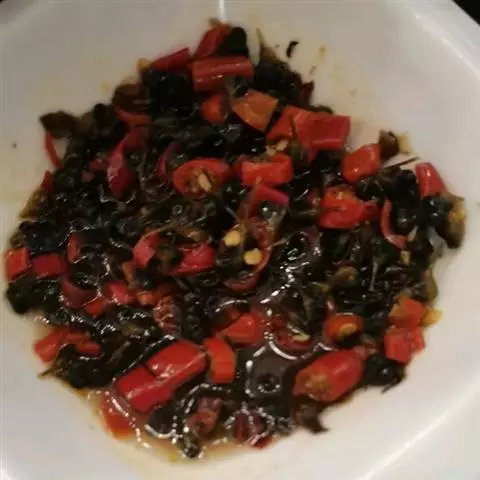 2、烧热2汤匙油,炒香蒜末,放入花甲干,以小火煸炒至水份稍干,盛起待用。