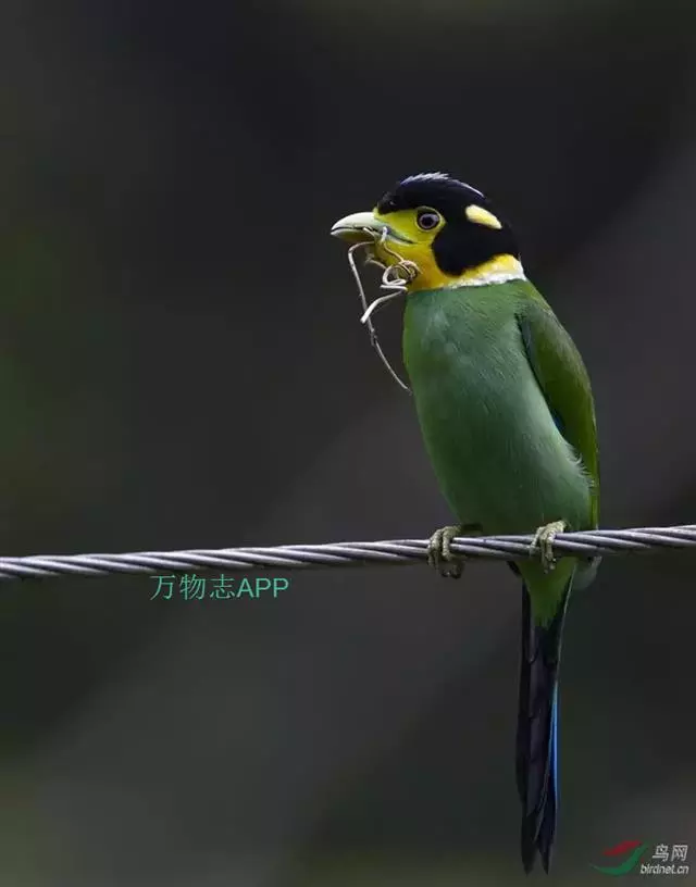 长尾阔嘴鸟是雀形目阔嘴鸟科的鸟类,体长约25厘米,是绿色阔嘴鸟。形长的楔形尾蓝色,喉及脸黄色,顶冠及颈背黑色。两翼黑并具显著的蓝色斑块。头顶具蓝色小点斑,眼后有一黄色点斑。亚成鸟多为绿色。结群活动于森林中层,有时与其他种类混群。多静栖于林下荫湿处的灌木或小树上,不善喉鸣和跳跃。食性以昆虫和其它节肢动物为主,也吃小型脊推动物和果实。分布于喜马拉雅山脉的山麓地带、中国南方、东南亚、苏门答腊及婆罗洲。