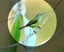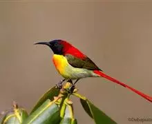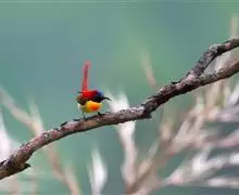 火尾太阳鸟为太阳鸟科太阳鸟属的鸟类。体长20厘米,色彩艳丽。雄鸟红色,具形长的艳猩红色中央尾羽。…全部>>