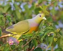 橙胸绿鸠体长24-29厘米,体重135-200克。是中等体型的绿鸠。黑色的翼上具醒目的黄色纵纹和翼缘。…全部>>