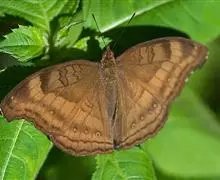 孔雀蛱蝶展翅宽50~60mm。翅膀表面红色,上、下翅有一大型彩色眼纹;翅膀腹面淡褐色,拟似烟熏枯叶…全部>>