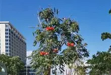 火焰树是紫葳科、火焰树属乔木,树皮平滑,灰褐色。奇数羽状复叶,对生,连叶柄长达45厘米;小叶13-17枚,叶片椭圆形至倒卵形,伞房状总状花序,顶生,密集;被褐色微柔毛,具有明显的皮孔;花冠一侧膨大,…全部>>