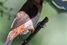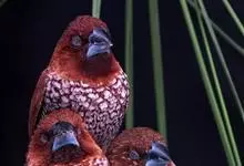 栗腹文鸟:小型鸟类,体长10-12厘米。嘴蓝灰色,基部粗厚,先端尖、呈圆锥状, 脚亦为蓝灰色,整个头、颈和上胸黑色,其余体羽栗色,或下胸和腹中央至尾下覆羽黑色。尾栗红色。全部>>