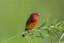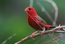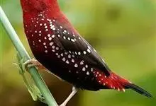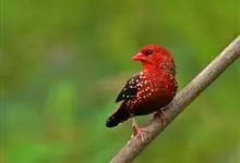 红梅花雀小型鸟类,体长9-10厘米。雄鸟通体朱红色,背、肩、胸等满布白色小斑点,两翅和尾黑褐色均具白色端斑,嘴红色,脚蜡黄色。雌鸟上体淡褐色或赭褐色,翅上中覆羽、大覆羽和内侧飞羽末端具白色斑点,…全部>>
