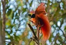 大极乐鸟是极乐鸟属中最大的鸟种。成年雄鸟体长可达到43厘米,雌性可达35厘米。雄鸟的额、颊、喉等墨绿色;头、颈黄色;上体暗赤栗色;腹部葡萄红色,胁部有长饰羽,其基部橙黄,中部黄色,…全部>>