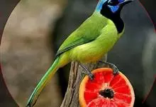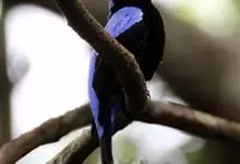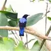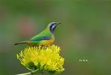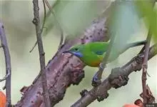蓝翅叶鹎:小型鸟类,体长15-18厘米。雄鸟通体草绿色,尾蓝绿色,肩和翅亮蓝 色,胸缀有黄色,颏、喉黑色。雌鸟颏,喉蓝绿色。栖息在海拔1500米以下的常绿阔叶林、次生林和林缘疏林灌丛中。…全部>>