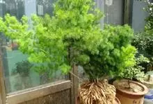 蓬莱松是天门冬科、天门冬属多年生丛生草本植物。宿存,圆柱形肉质根,纵截面为绿色和表面灰色。植株高可达3米。茎呈圆柱形或近四边形,底部木质化,具有灰色或灰褐色。幼嫩的茎在每个节上都被紫绿色鳞片包,…全部>>