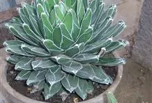 皇后龙舌兰是天门冬科、龙舌兰属多年生草本多浆植物。无主茎,叶丛生,莲座状,株幅40厘米。叶较多,先端较细,三棱形,腹面扁平,背面圆形呈微龙骨凸起,长10-30厘米,宽2.5-7.5厘米,厚肉质硬,…全部>>