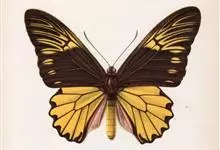 金裳凤蝶是凤蝶科、裳凤蝶属的动物。金裳凤蝶身体呈黑色,头、颈和胸侧有红毛,腹部有黑黄两色相间条纹,雄蝶前翅黑色,具黑天鹅绒光泽,各脉两侧灰白色,后翅金黄色,各室外缘有等腰三角形黑斑1枚,斑内侧有晕,…全部>>